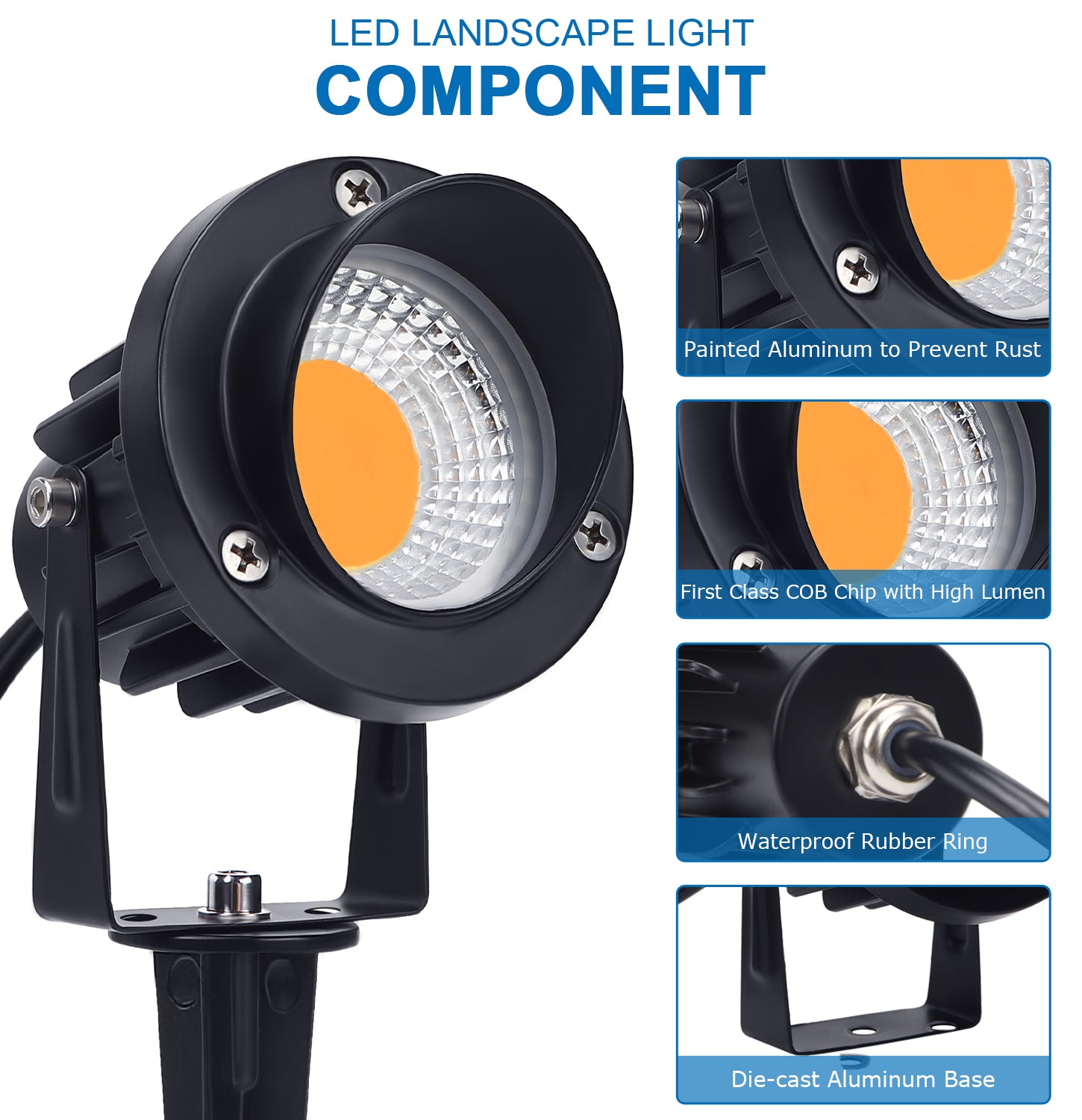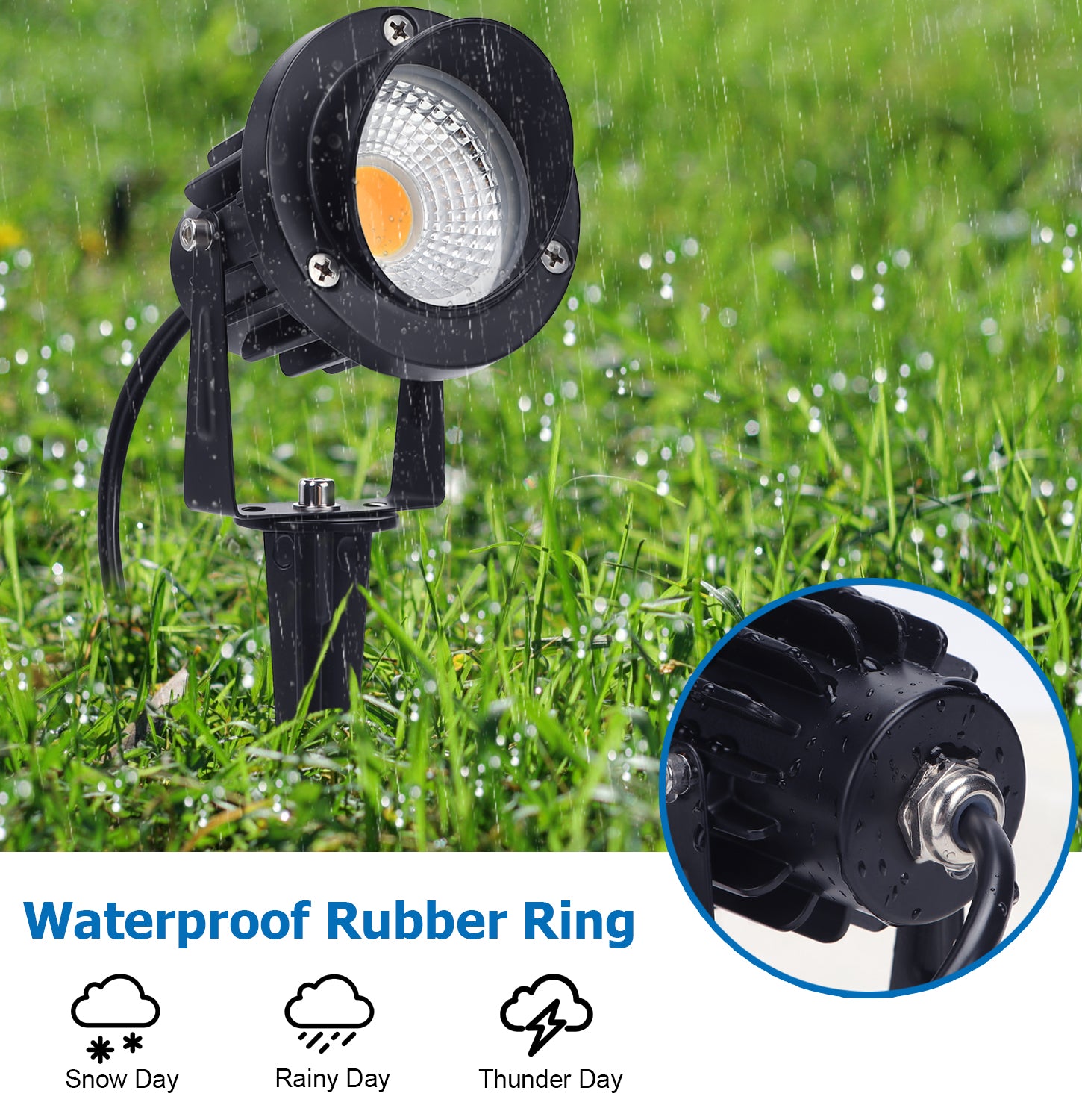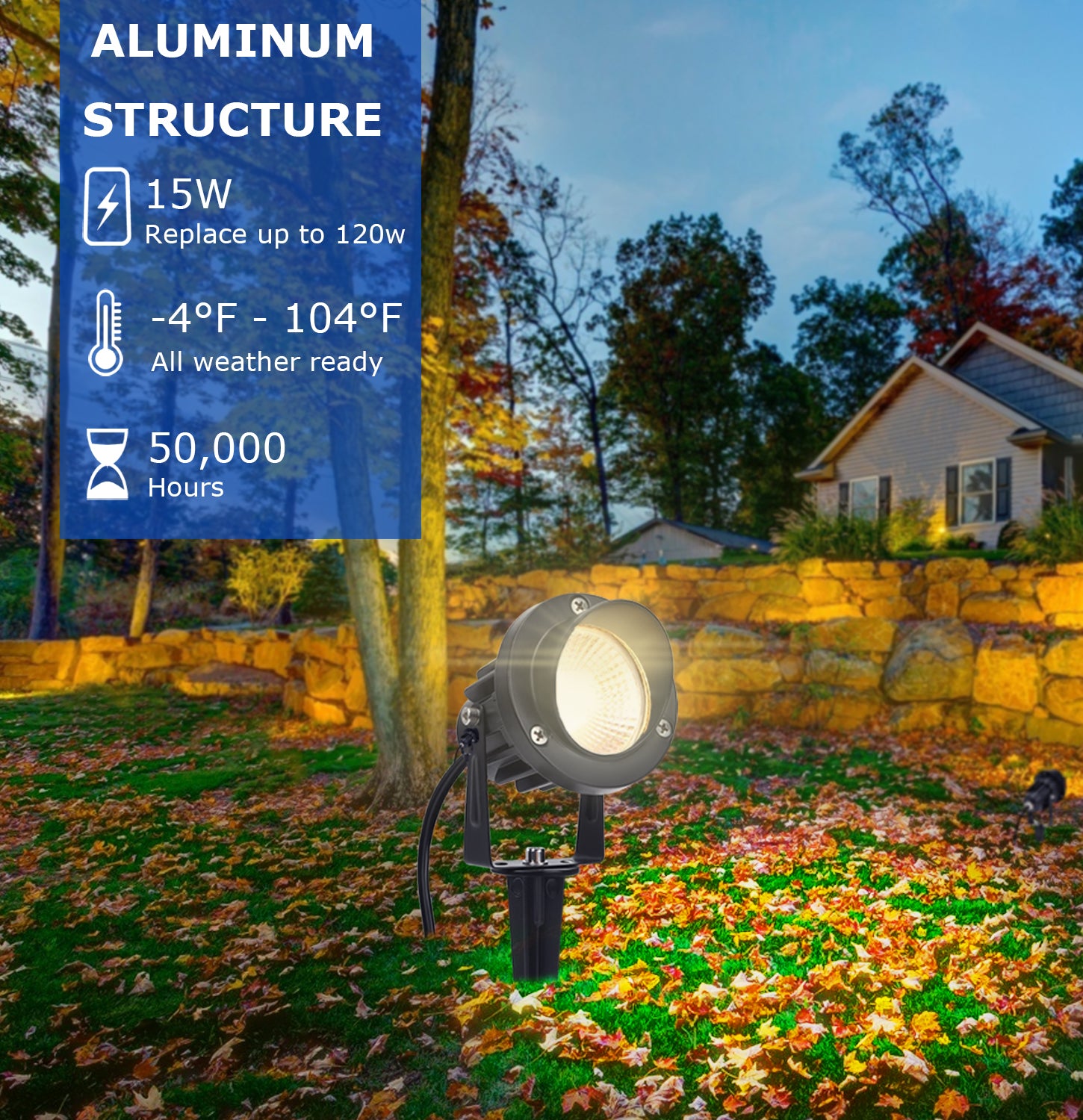 【Upgrade Metal Body and IP65 Waterproof Landscape Spotlights】Thick aluminum body and glass lens cover design withstand rainy and snowy weather; IP65 waterproof design which greatly improves the stability of outdoor lighting and long-term use.
