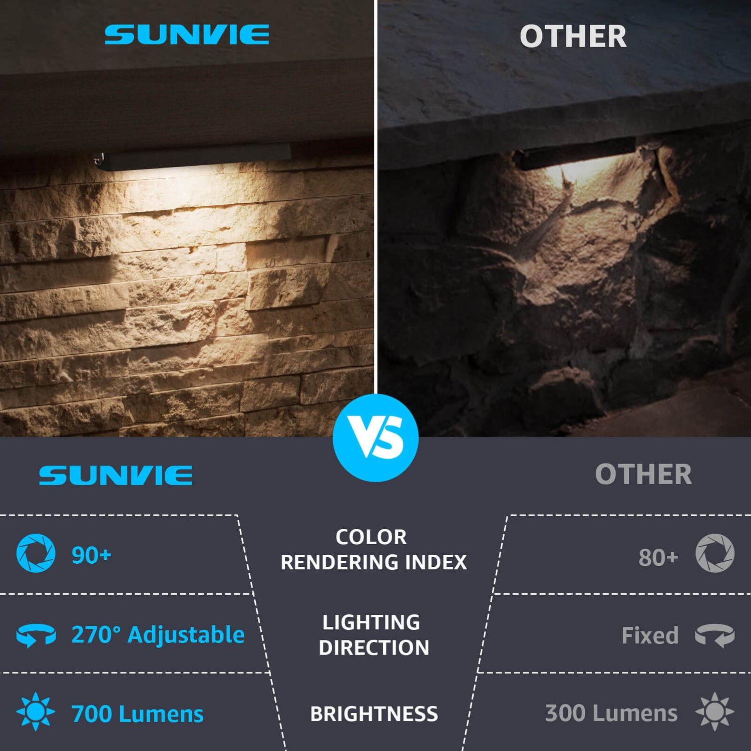 Enhance your landscape with SUNVIE's 12-pack low-voltage retaining wall lights, designed to provide bright, energy-efficient lighting along walls, steps, and pathways. Featuring 270° adjustable heads and high-quality 5W LEDs, these lights offer 500 lumens of 2700K warm white illumination with CRI 90+ for vibrant, natural-looking light.