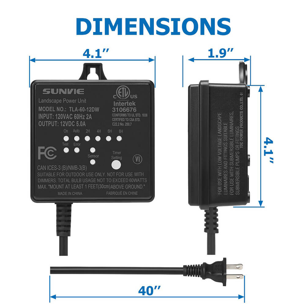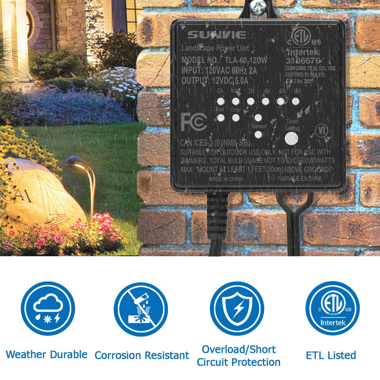 - Dusk to Dawn Sensor: SUNVIE 60W transformer with built-in photoelectric sensor for automatic dusk-to-dawn lighting.