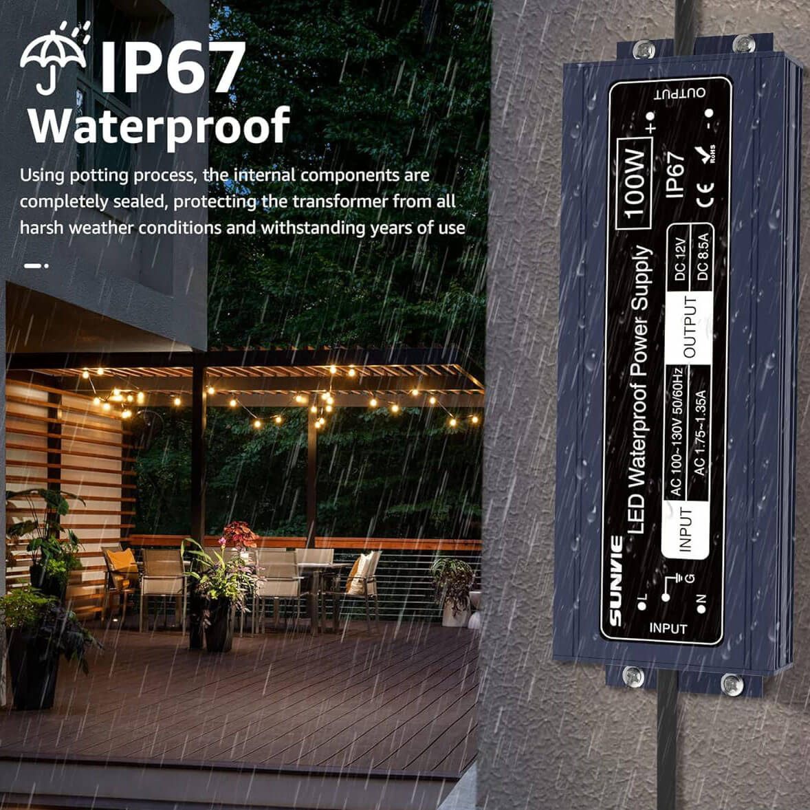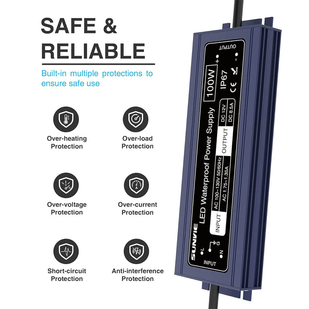 - High Safety: Automatic protection for short circuit, overload, over voltage, over current, over temperature. Aluminum housing for heat dissipation, waterproof IP67 for outdoor use. Automatic recovery post-fault.