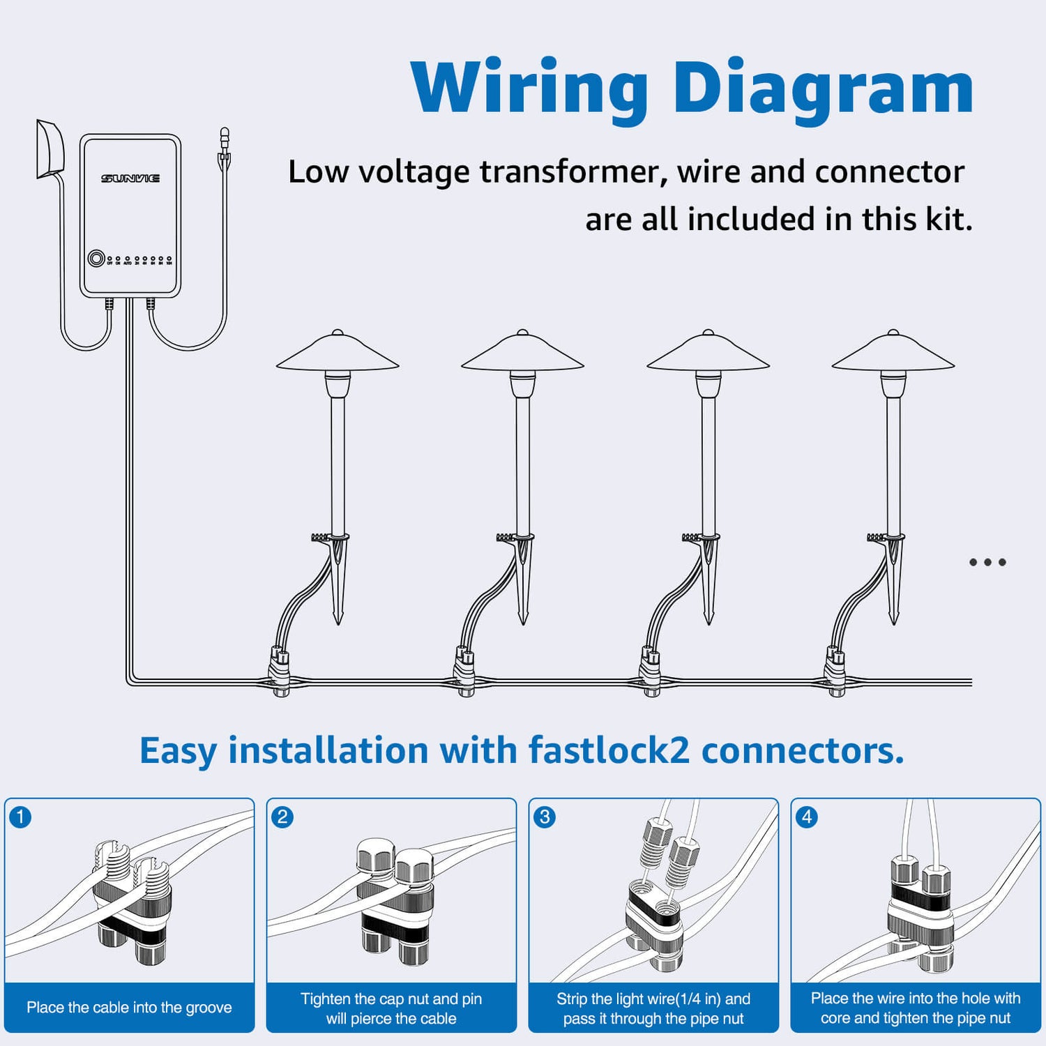 - Total Installation Flexibility: Design your perfect layout by placing each of the 8 lights anywhere along the 100ft low-voltage wire. The tool-free FastLock2 connectors make wiring simple and fast.