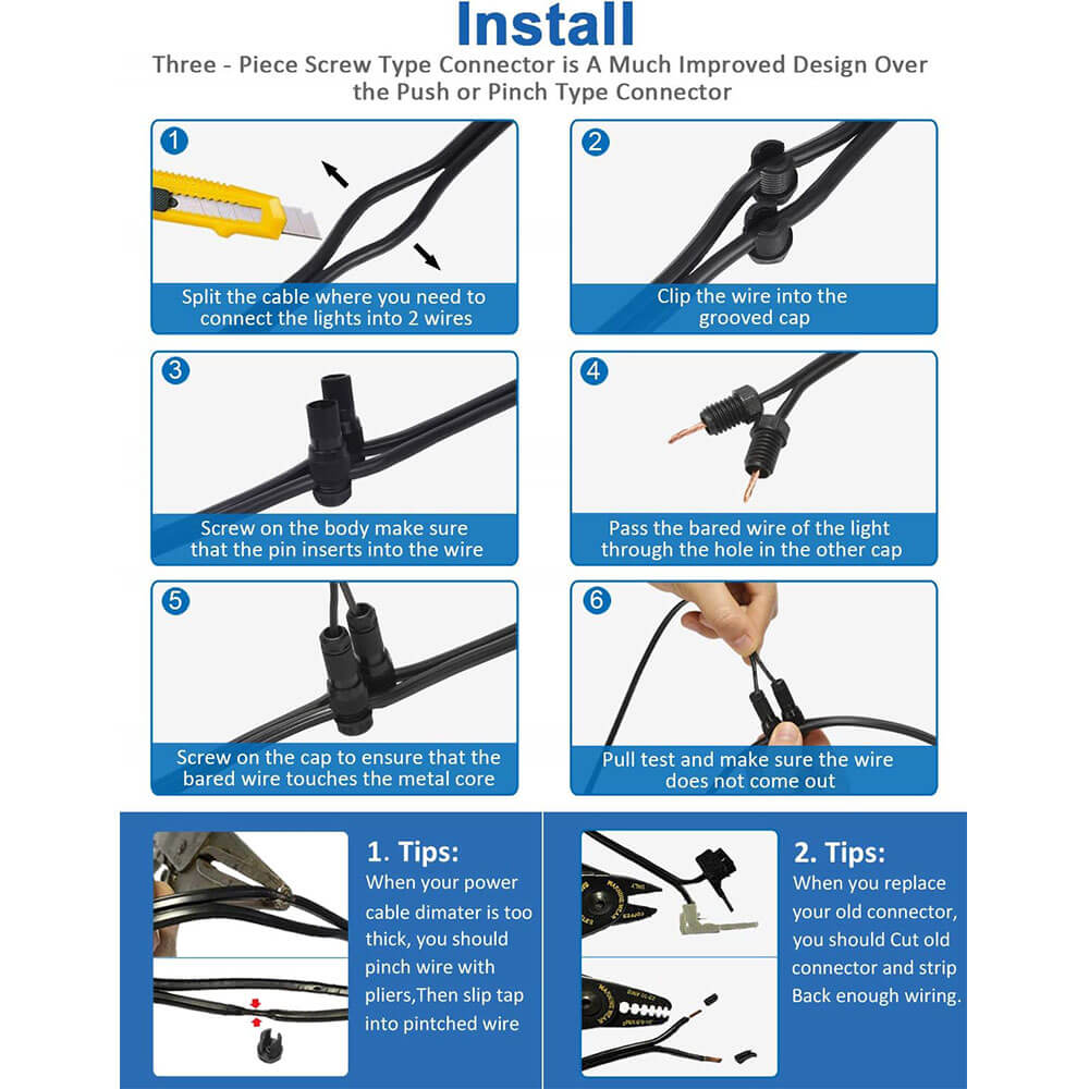 - Versatile Use: Compatible with 12-14 gauge wires for various outdoor lighting applications, easy replacement for many brands' connectors. Suitable for power cord of 12/14/16/18 AWG and light cord of 14/16/18/20 AWG.