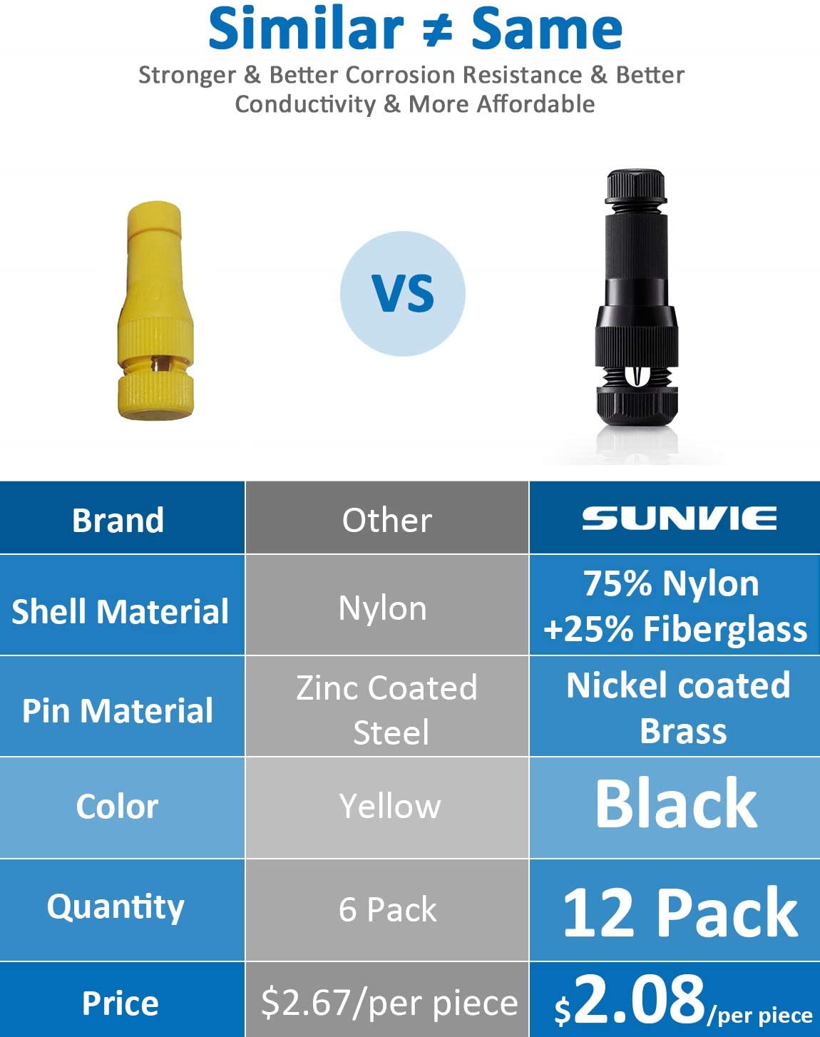- Ultra Strong Nylon Plastic and Brass Pin:SUNVIE landscape lighting connectors are made of extremely sturdy nylon plastic + fiberglass mixture and CNC machined nickel- plated brass pins to ensure corrosion resistance and electrial conductivity for outdoor use.