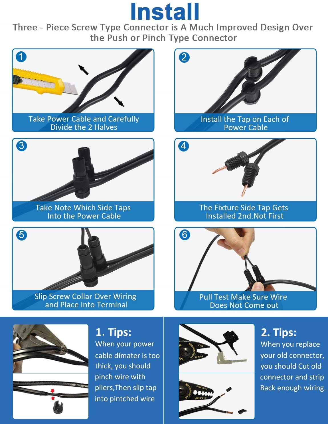 - Super Easy to Install: No crimping, No cutting, No splicing. Great improved design and high quality machining ensures reliable connections for years.Only take 3 minutes to connector your landscape lights easily and quickly.
