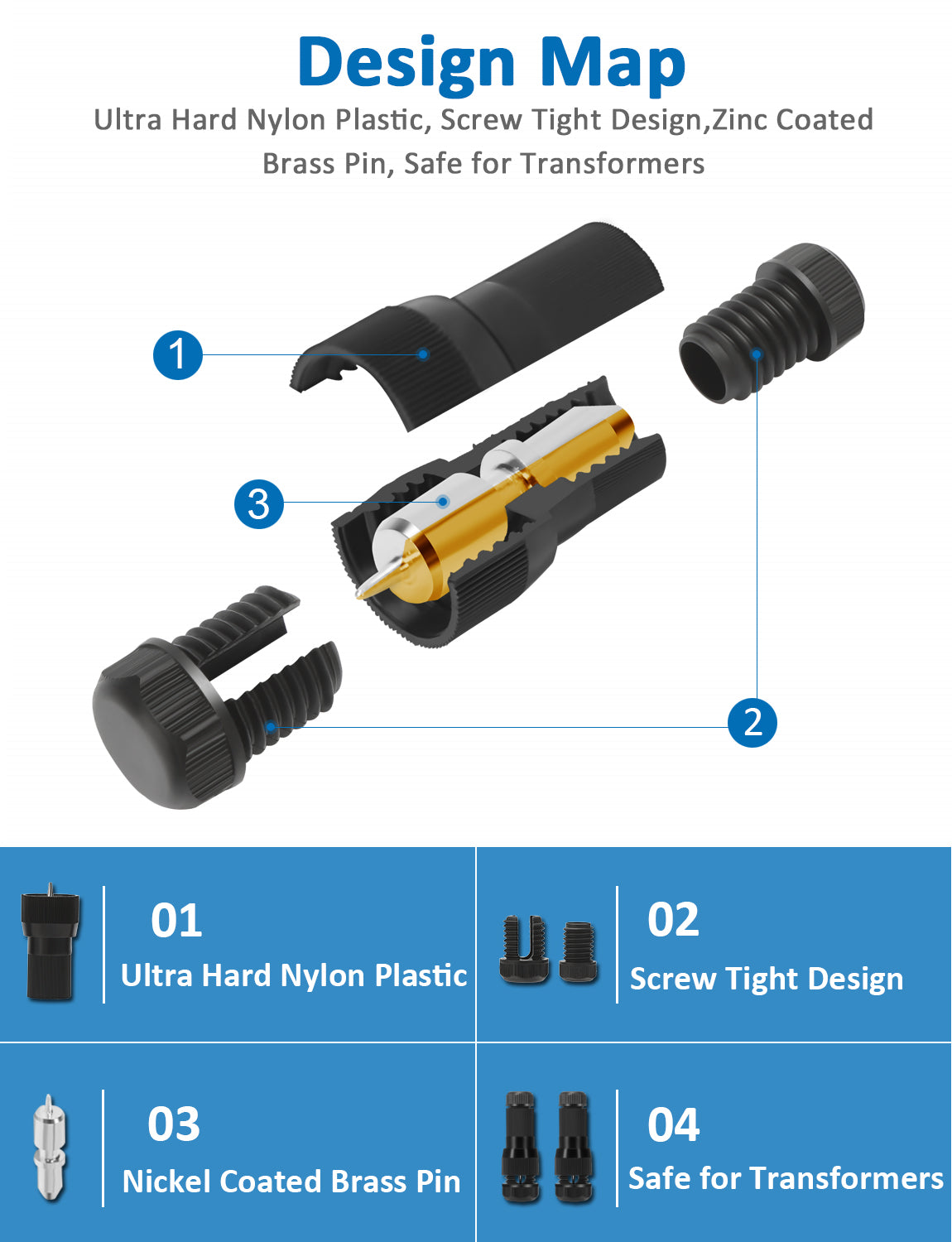 - Ultra Strong Nylon Plastic and Brass Pin:SUNVIE landscape lighting connectors are made of extremely sturdy nylon plastic + fiberglass mixture and CNC machined nickel- plated brass pins to ensure corrosion resistance and electrial conductivity for outdoor use.