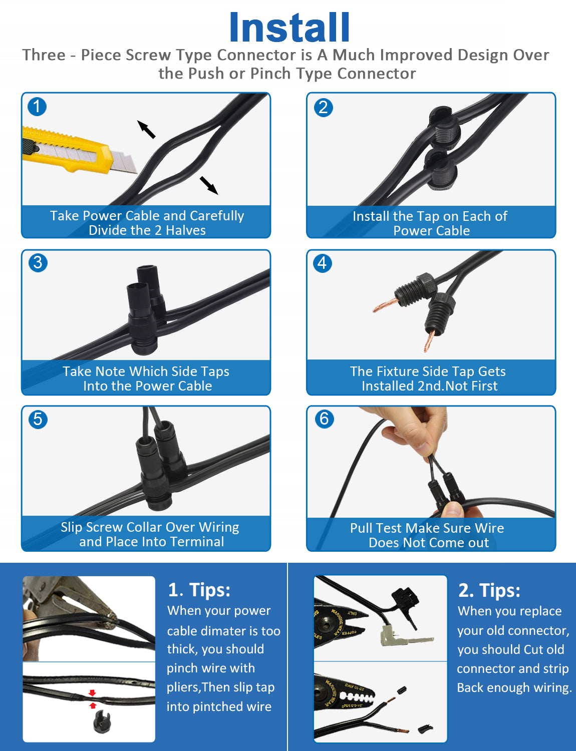 - Super Easy to Install: No crimping, No cutting, No splicing. Great improved design and high quality machining ensures reliable connections for years.Only take 3 minutes to connector your landscape lights easily and quickly.